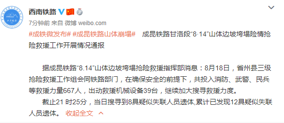 新京报快讯 18日晚,西南铁路在其官博发布成昆铁路甘洛段"8·14"山体边坡垮塌险情抢险救援工作开展情况通报。以下为全文: