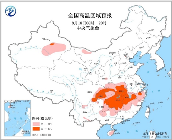 预计8月18日白天,江南、华南西北部、西南地区东部、江淮西部、江汉、陕西南部以及新疆南疆盆地等地有35℃以上的高温天气,其中,江西中北部、湖南、湖北中东部、贵州东北部、四川东部、重庆等地的部分地区最高气温可达37~39℃。