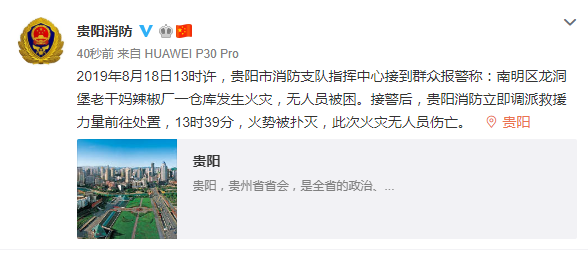 新京报快讯 据贵州省贵阳市消防救援支队官方微博消息,8月18日13时许,贵阳市消防支队指挥中心接到群众报警称,南明区龙洞堡老干妈辣椒厂一仓库发生火灾,无人员被困。13时39分,火势被扑灭。据悉,此次火灾无人员伤亡。