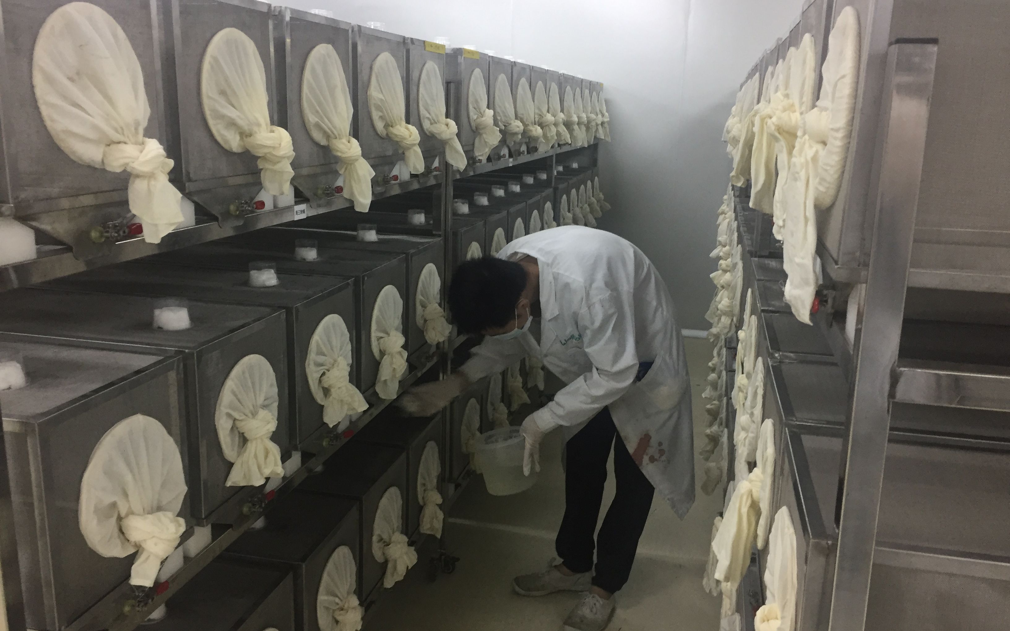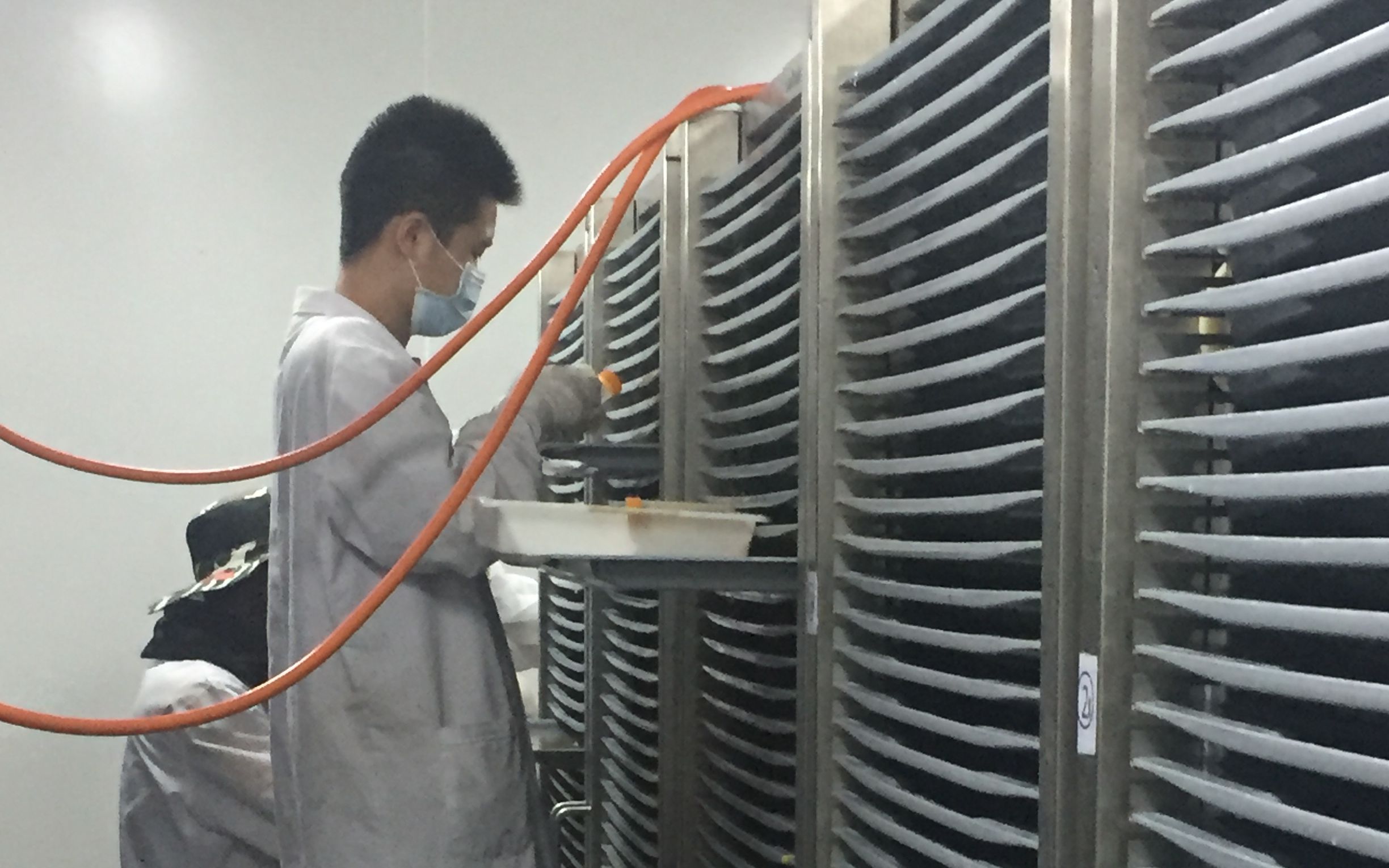 那是一个空气中弥漫着发面团酸味儿的车间。为了节约空间,一个个"水盘"像碟片一样叠摞在一人多高的架子上。带着养蜂面罩的工作人员将培养瓶里的液体和卵一同倒入水盘,然后再倒入黄褐色的"营养液",这些卵很快就会变成孑孓,也就是蚊子的幼虫。