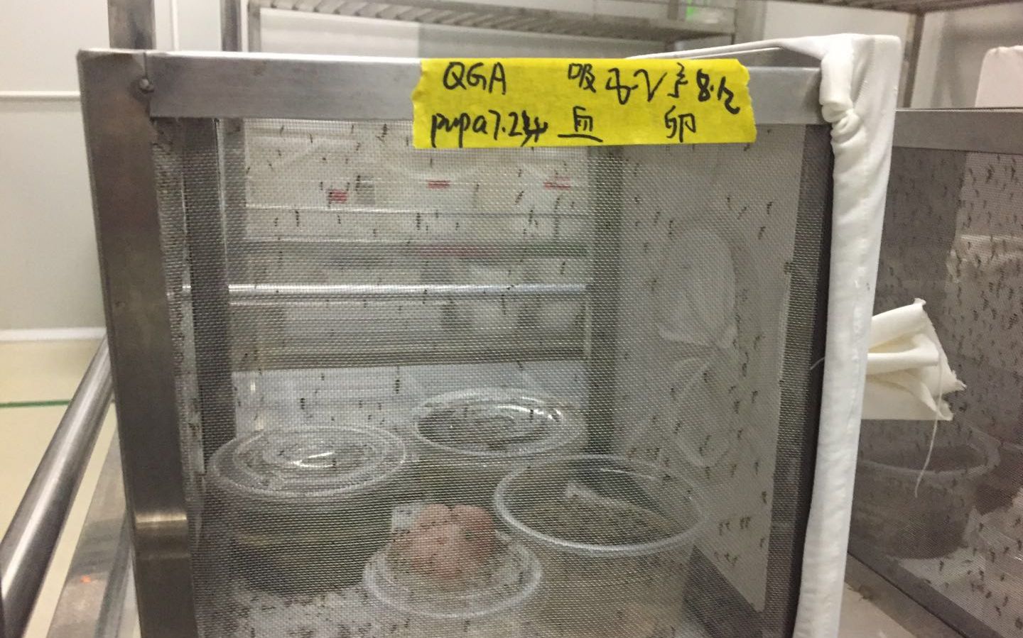 在成虫饲养车间,一排排纱网有序地挂在架子上,像一艘艘航母,装满了即将奔赴战场的"特工"雄蚊。它们将以最快的速度被送往战场,同雌蚊交配。