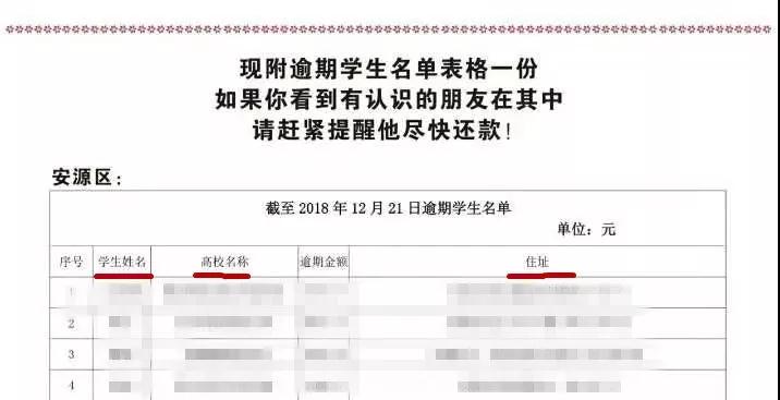 但是,平心而论,这则催款通知的"真正威力",恐怕还不在"警示"承担违约责任、信用惩戒等法律责任上。翻看报道,这则通知不仅强调逾期后果、还款时间和方式,还附带了一份"截至2018年12月21日逾期学生名单",包括了姓名、高校、逾期金额和住址等学生信息。对于一些欠债不还的大学生,这些信息的公布意味着,"老赖"的身份可能会家喻户晓,为了"脸面"计,也得把欠款赶快还上。