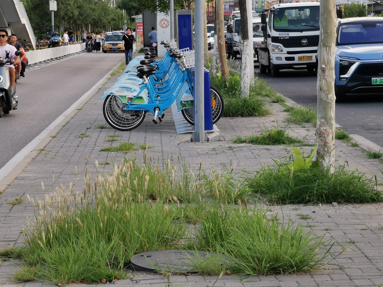 立汤路东侧的一个公租自行车车站长了不少杂草。