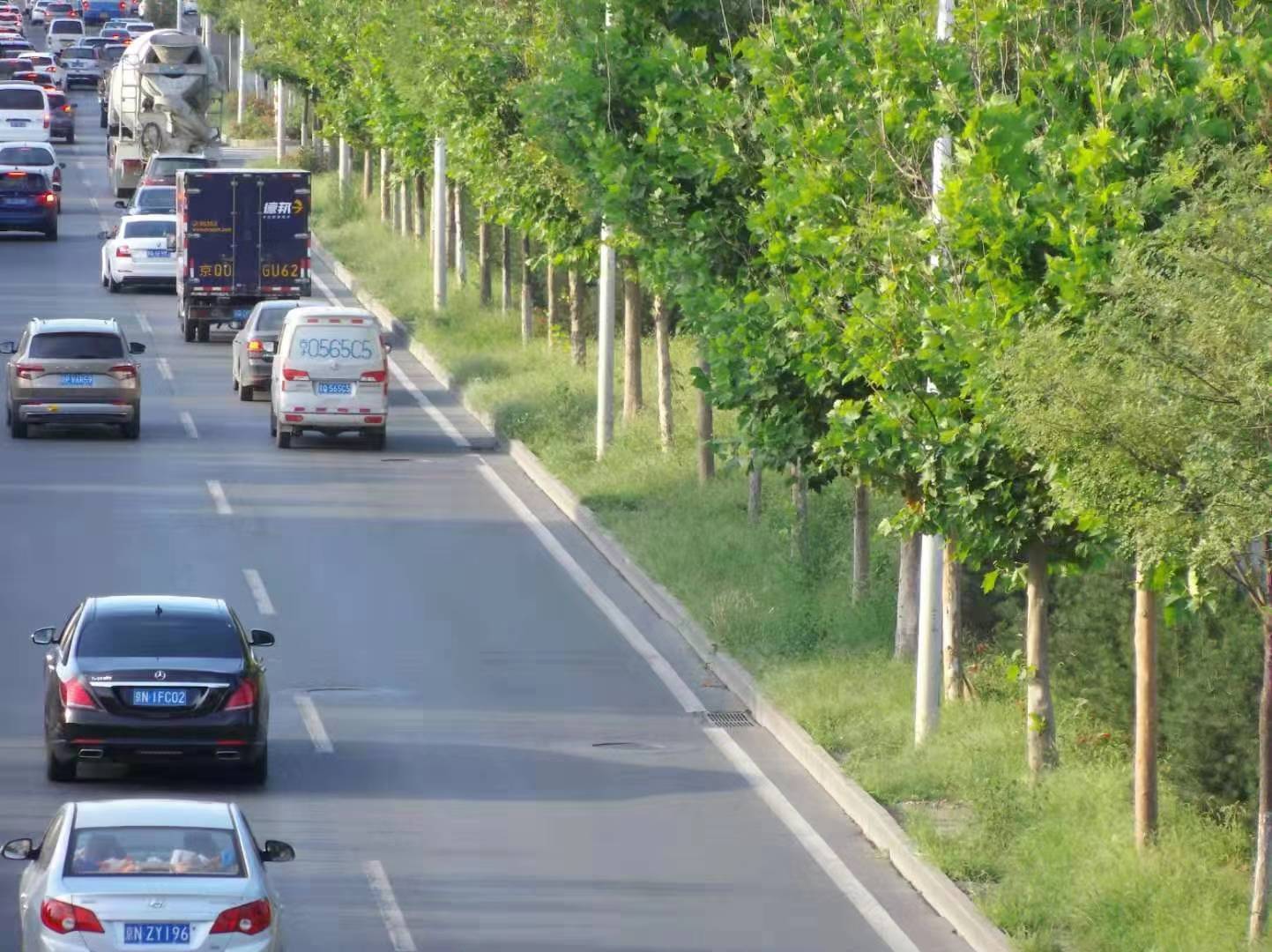 马路西侧中宇汽车服务中心外主辅路之间的绿化带内长了不少杂草。